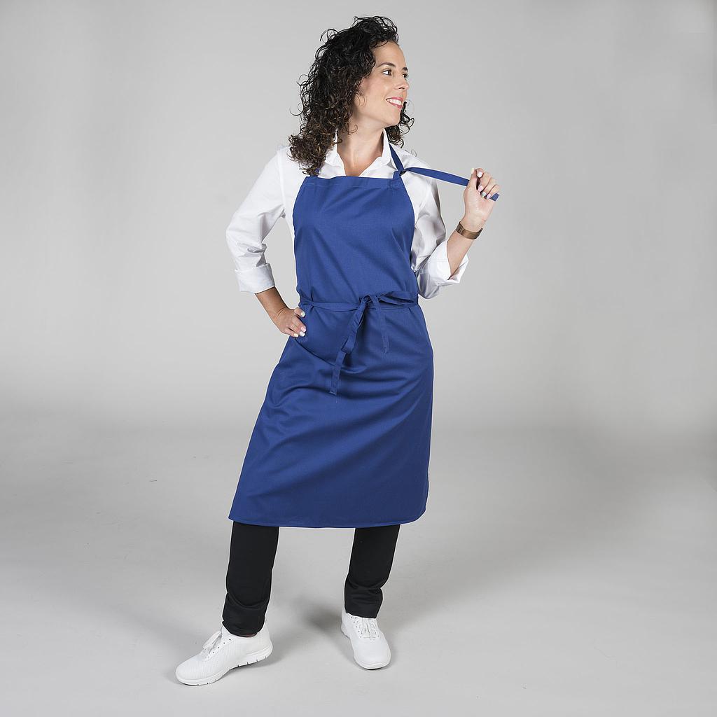 Delantal sin bolsillos, con peto y hebilla reguladora en el cuello para ajustar. Cintas para anudar del mismo tejido.