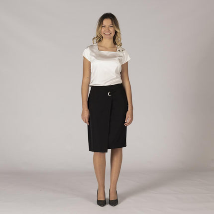 La falda cruzada sin bolsillos TRIVIAL presenta un diseño ajustado sin cinturilla, lo que garantiza un look elegante y cómodo durante largas jornadas laborales. Esta característica proporciona una apariencia profesional y pulida.