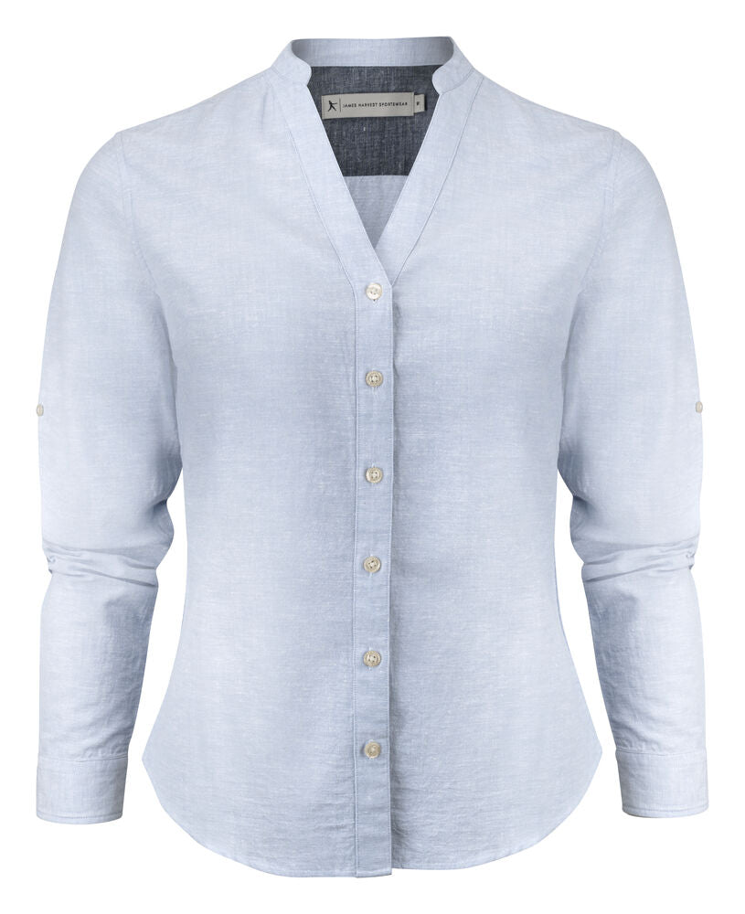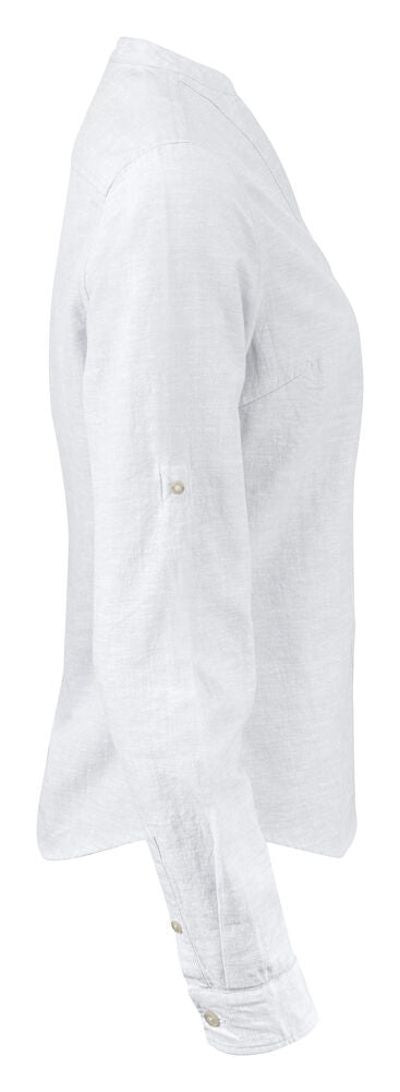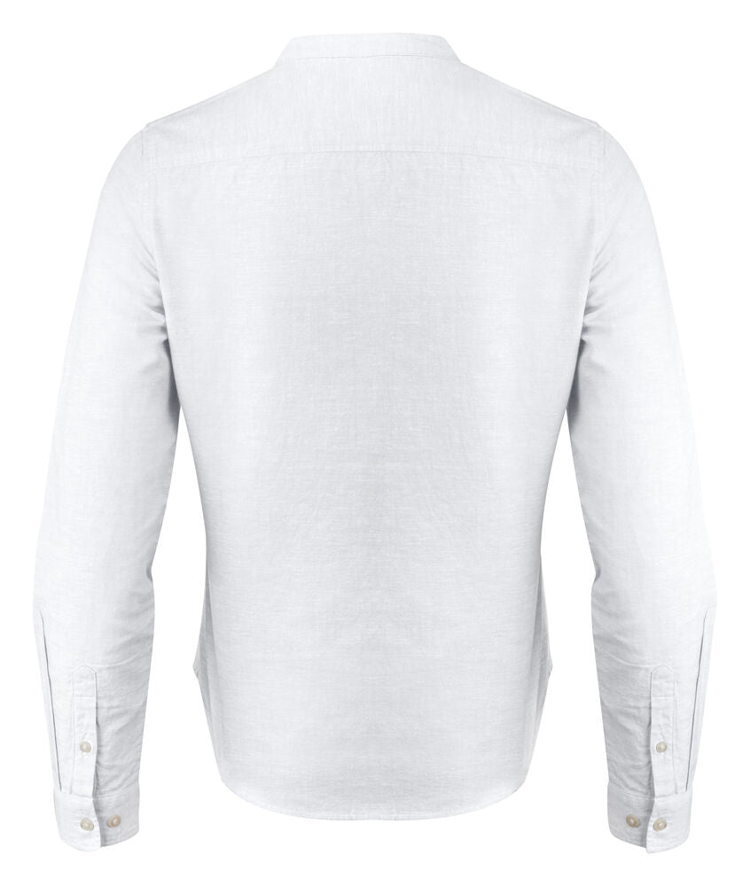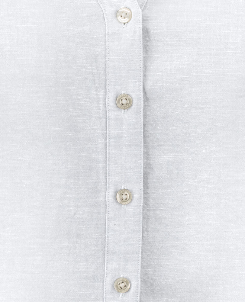 Camisa de mezcla con lino, cuello Mao y puños ajustables. Botones color perla. Tejido a contraste en canesú y puños. Hilo previamente teñido.