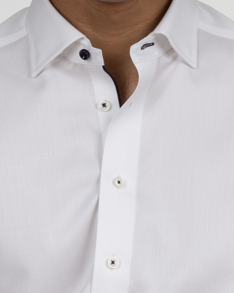 Color liso. Sarga fina. Lavable a máquina. Tratamiento medioambiental patentado Non-Iron. 100% algodón compacto de fibra larga. Canesú dividido en espalda para un contorno suave de los hombros y una mayor libertad de movimiento. Las costuras principales selladas ayudan a que la camisa luzca impecable lavado tras lavado. No se arruga. Cuello con botones ocultos. Manga larga. Ojal adicional para gemelos. Botones de 4 mm de grosor.