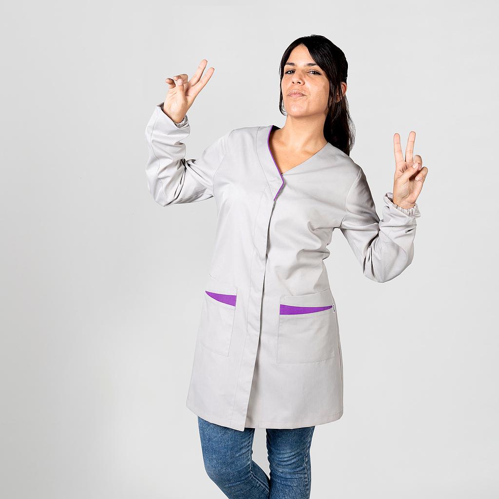 La bata está confeccionada en tela plana antibacteriana en tono gris, con detalles en malva o turquesa en el cuello y los bolsillos. Esta tela tiene propiedades bactericidas que evitan los malos olores y una barrera de protección sanitaria. También cuenta con un acabado hidrófugo que repele líquidos y resistencia contra las manchas.