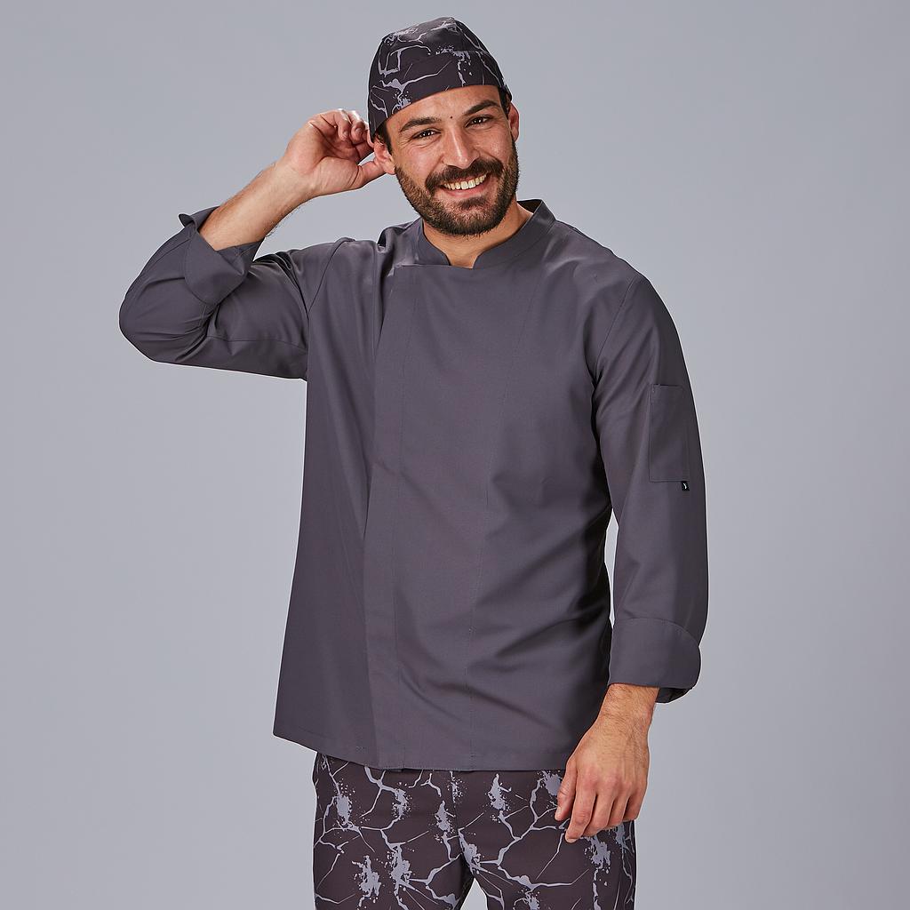 La chaqueta de cocina de hombre VIDAL presenta un diseño elegante con manga larga, cuello mao, y cierre cruzado mediante botones de presión ocultos. El cuello mao le brinda un toque distintivo de estilo mientras que los puños vueltos añaden comodidad y un ajuste seguro.