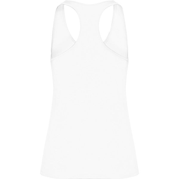 Camiseta técnica de tirantes entallada transpirable. Espalda nadadora con escote y sisas ribeteado. Tejido poliéster tacto algodón de secado fácil. Corte entallado.