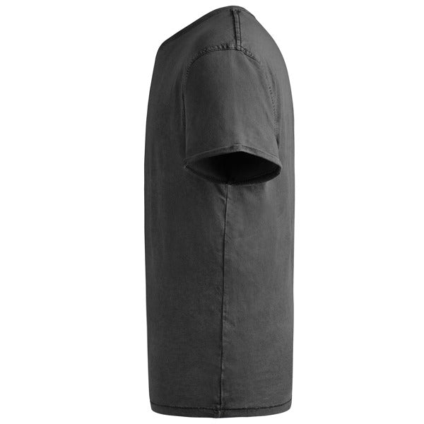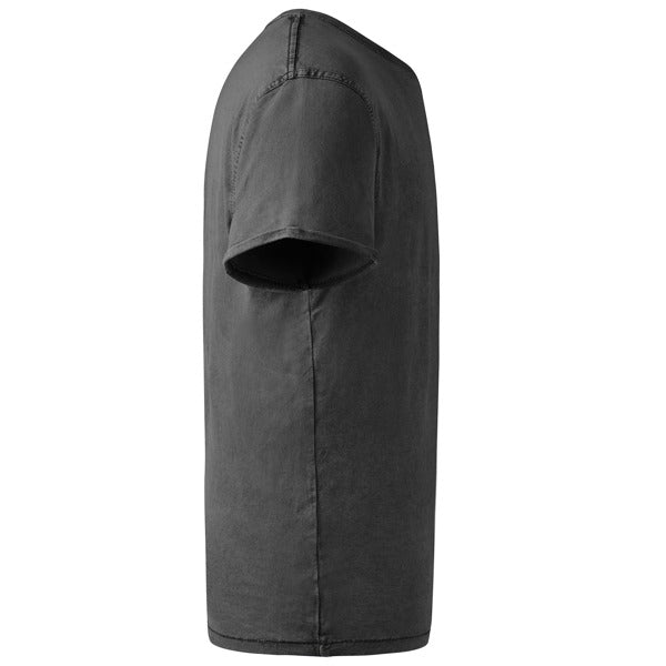 Camiseta de manga corta efecto jeans. Cuello redondo en canalé 1x1, con cubrecosturas de refuerzo interior de hombro a hombro. Doble costura en sisas. Apertura de manga con dobladillo.
