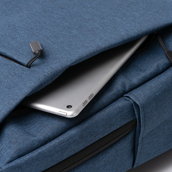 Mochila realizada en 600D RPET con acabado jaspeado. Gran compartimento interior con bolsillo para portátil de 15". Bolsillo exterior con cierre de cremallera y bolsillo lateral. Asas acolchadas. Cinta para trolley.